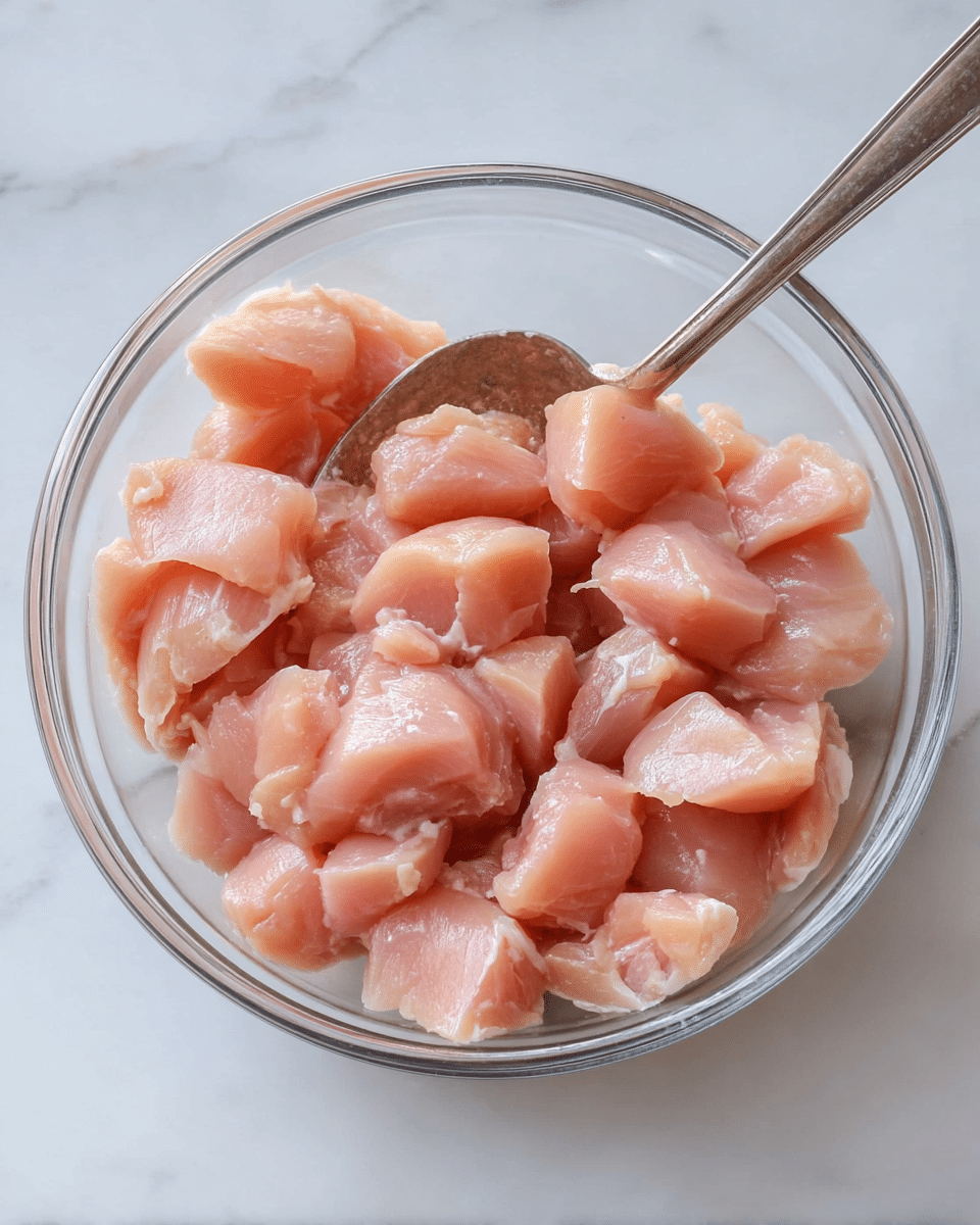 I marinate it briefly in soy sauce and cornstarch—it helps lock in moisture during cooking.