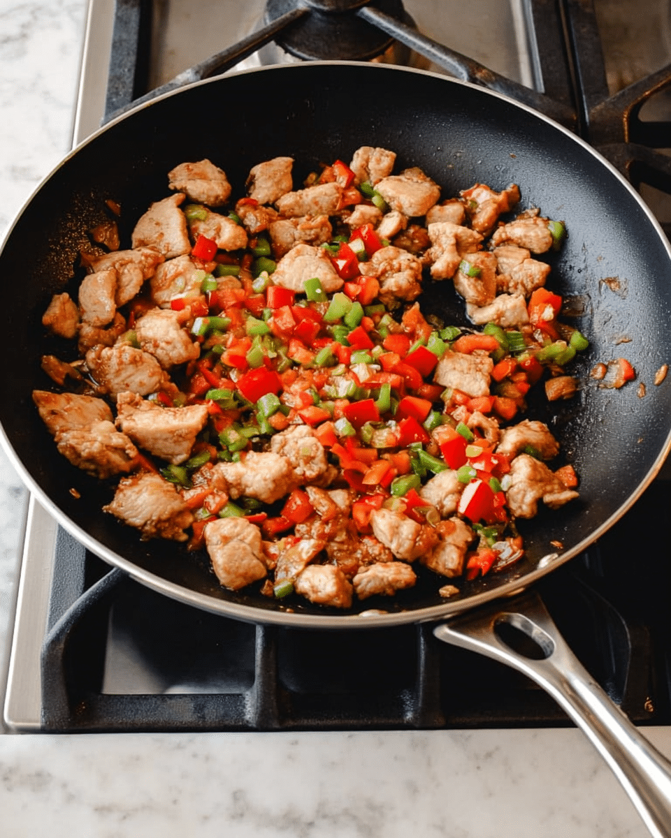 - Pour in the prepared sauce and stir constantly until it thickens and coats the chicken.