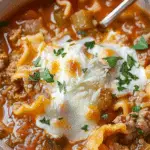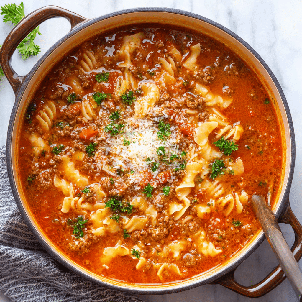 A hearty, comforting soup that captures all the flavors of lasagna—rich tomato broth, ground beef, pasta, and a cheesy topping that melts into every bite.