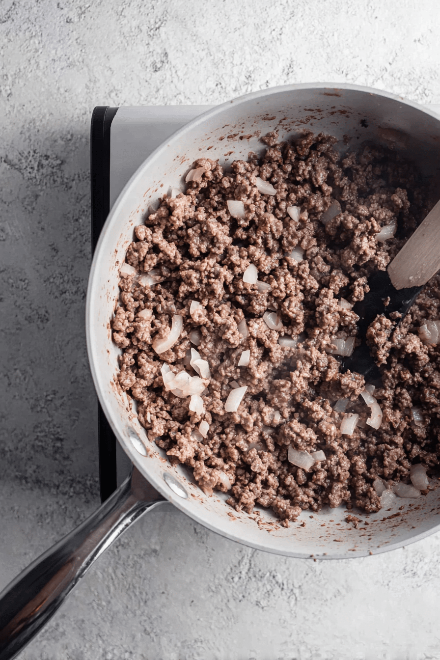 - Heat olive oil in a large pot over medium-high heat. Add ground beef and cook until browned.