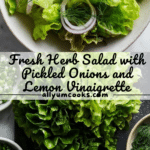 Just before serving, combine the greens, herbs, and pickled onions in a large bowl. Start by adding about half the vinaigrette, then toss gently to coat everything evenly without bruising the delicate leaves. Taste and drizzle more dressing as needed, seasoning with salt and pepper to your preference. The goal is a salad that’s tender, bright, a little puckery from the pickled onions, and absolutely fresh in every bite.