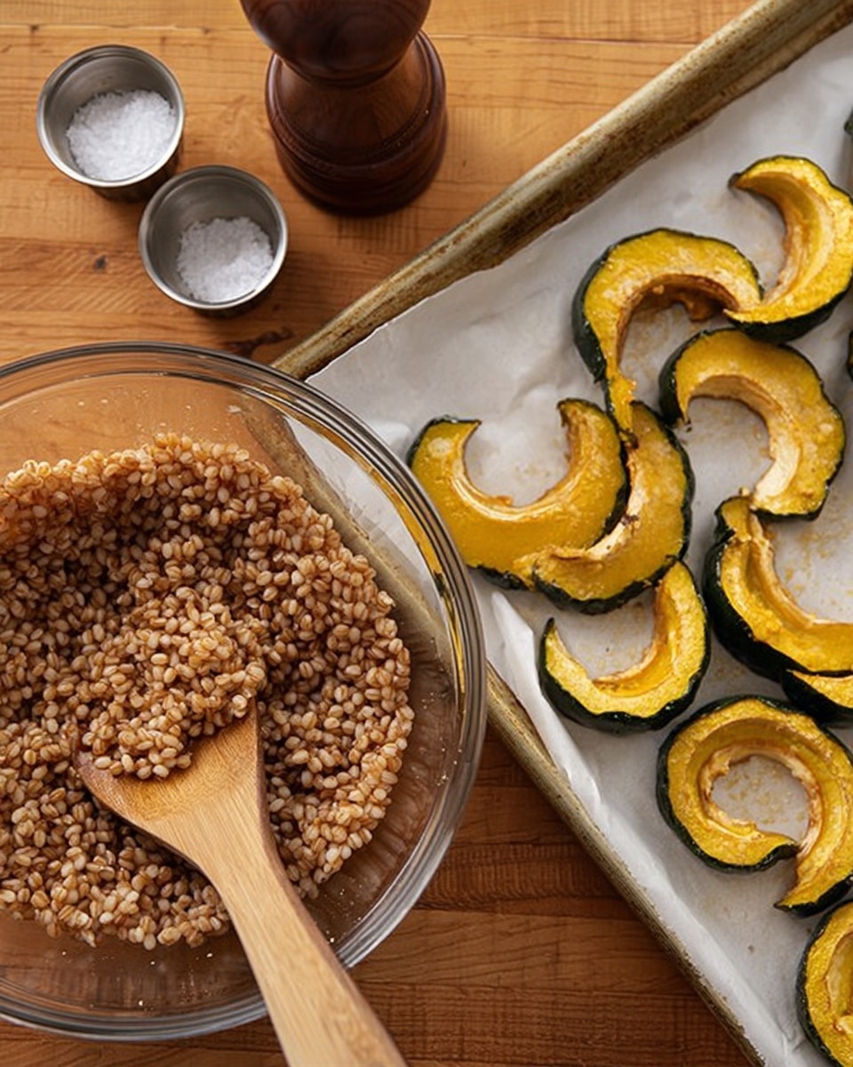 - While the squash roasts, cook the farro according to the package instructions (usually simmered in salted water for about 25–30 minutes until tender but still chewy). Drain any excess water and let it cool slightly.