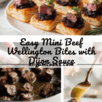 Mini Beef Wellington Bites are an elegant appetizer featuring tender Angus beef tenderloin wrapped in flaky puff pastry with a savory mushroom duxelles and aromatic herbs. These bite-sized treats are served with a creamy Dijon sauce, making them perfect for parties or special occasions.