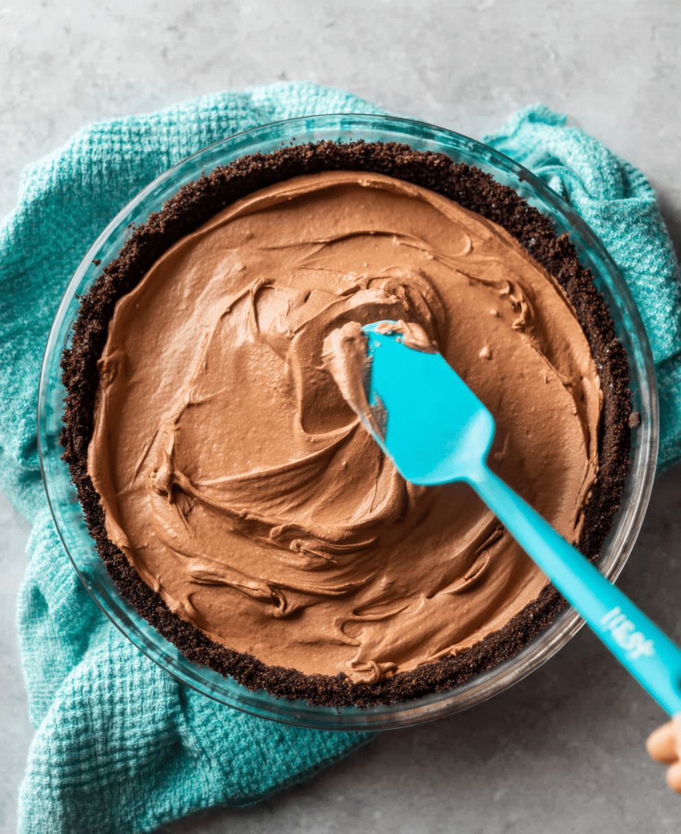 - I spread the remaining ganache over the chocolate filling and refrigerate the pie for at least 4 hours, or until fully set.