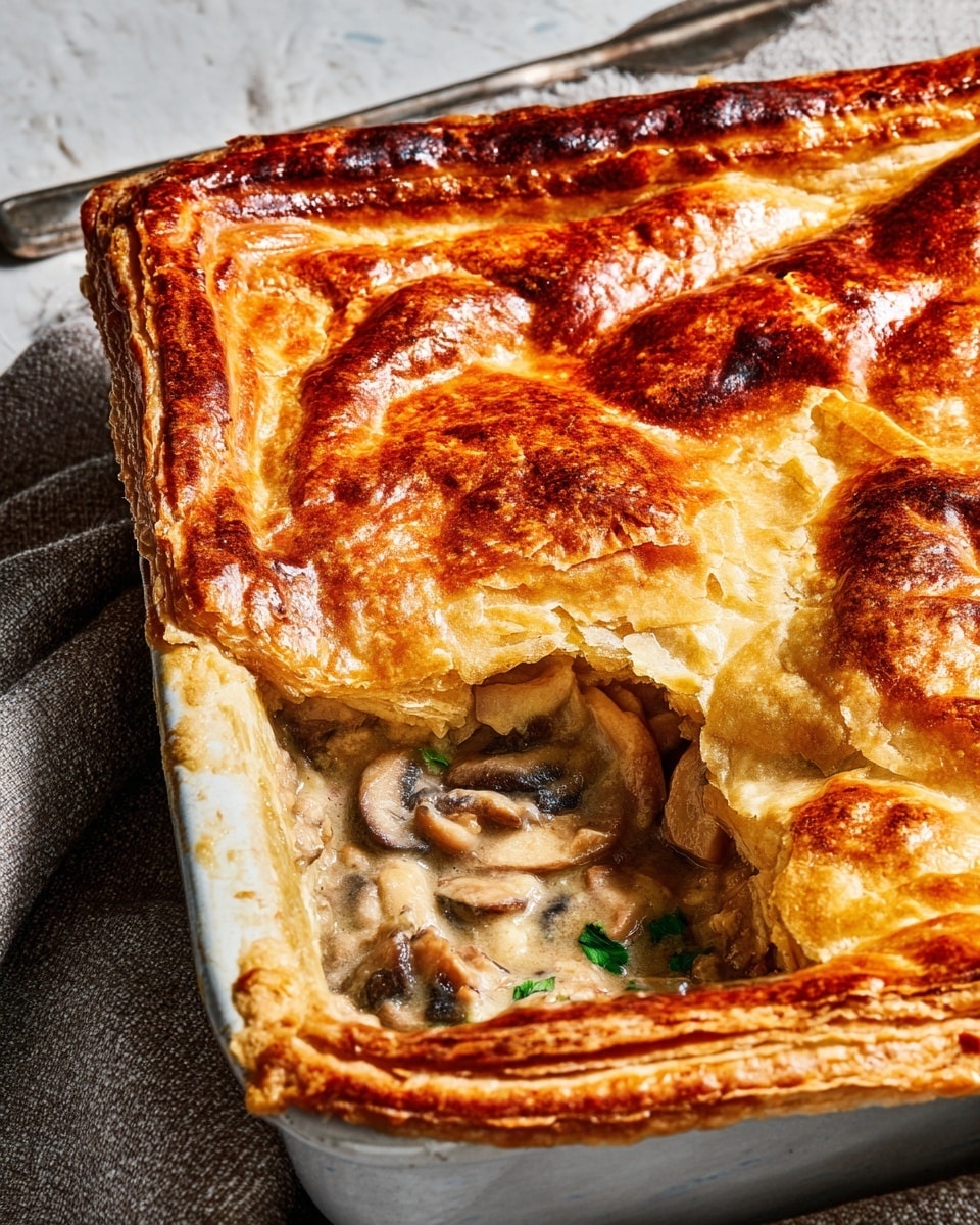 A comforting chicken and mushroom pie featuring tender chicken thighs, earthy mushrooms, and creamy soft cheese, all baked under a golden puff pastry crust for a cozy, satisfying meal.