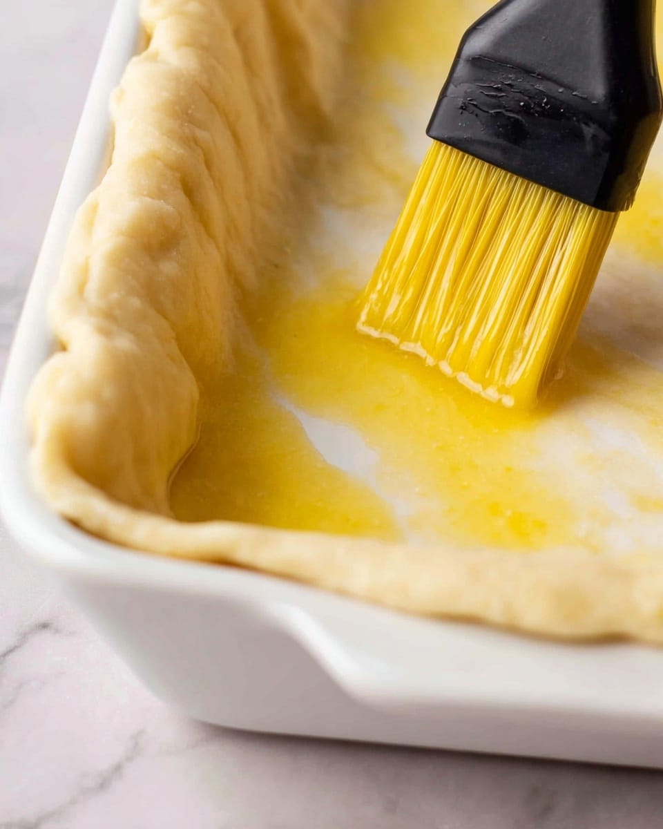 - Transfer the mixture to a deep baking dish (about 20 × 25 cm). Brush the rim with beaten egg.