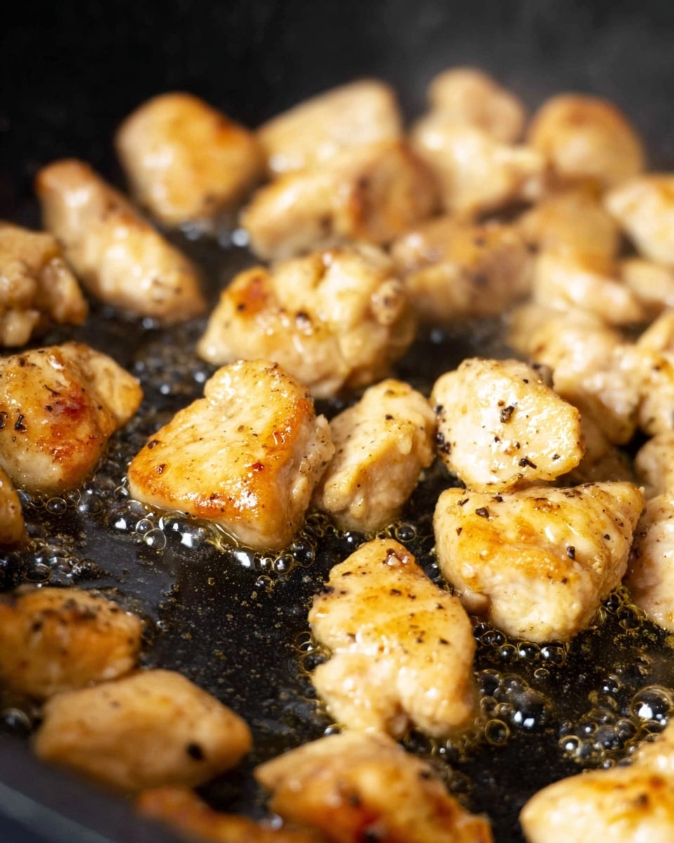 - Add the chicken strips and the crushed garlic to the pan; fry for approximately 5 minutes — the chicken doesn’t have to be fully cooked at this stage.