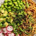 - Assemble salad: Combine the dressed noodles with cucumber, radishes, sugar snap peas, edamame, and herbs. Divide into bowls, top with diced avocado, and finish with extra scallion oil and soy sauce as desired.