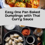 Delicious and easy One Pan Baked Dumplings simmered in a rich Thai red curry coconut sauce. This recipe combines the convenience of frozen dumplings with bold flavors from coconut milk, red curry paste, and fragrant ginger and garlic. Perfect for a quick and comforting meal served with chili oil and fresh garnishes.