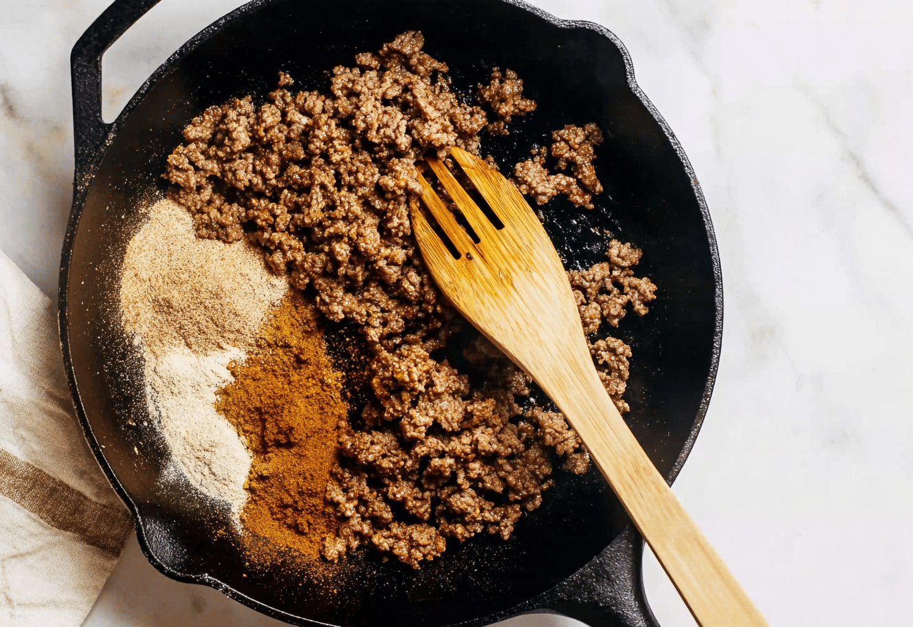 - I start by browning the ground beef in a large skillet over medium heat, breaking it up as it cooks. Once fully browned, I drain any excess fat.