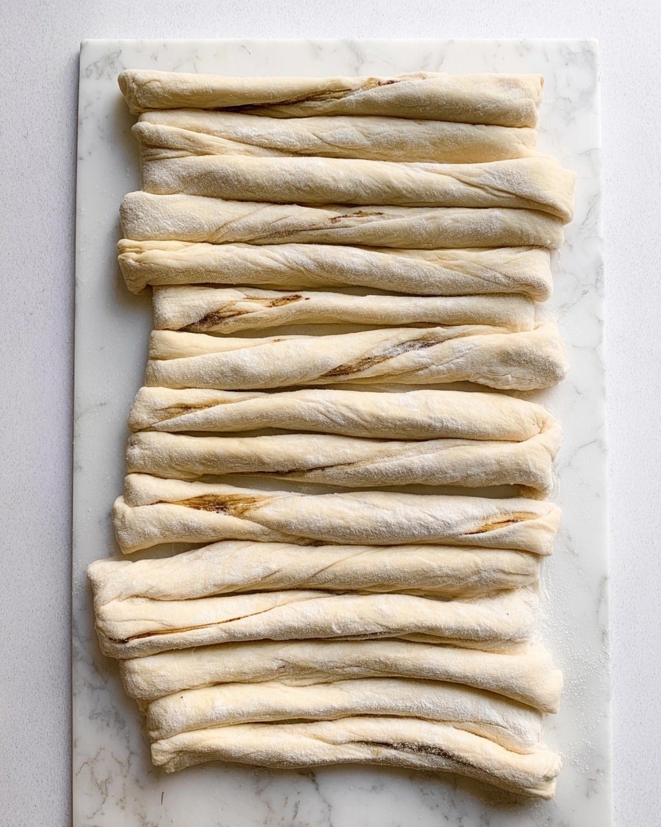 - Starting from one long side, I tightly roll the dough into a log. I trim the edges and cut the log into 12 even pieces.
