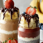 - Assemble Peanut Butter and Banana: Layer the overnight oats in a jar with a tablespoon of your choice of nut butter. Top with fresh banana slices, sprinkle chopped nuts and dark chocolate chips. Optionally drizzle melted chocolate or Nutella for extra richness.