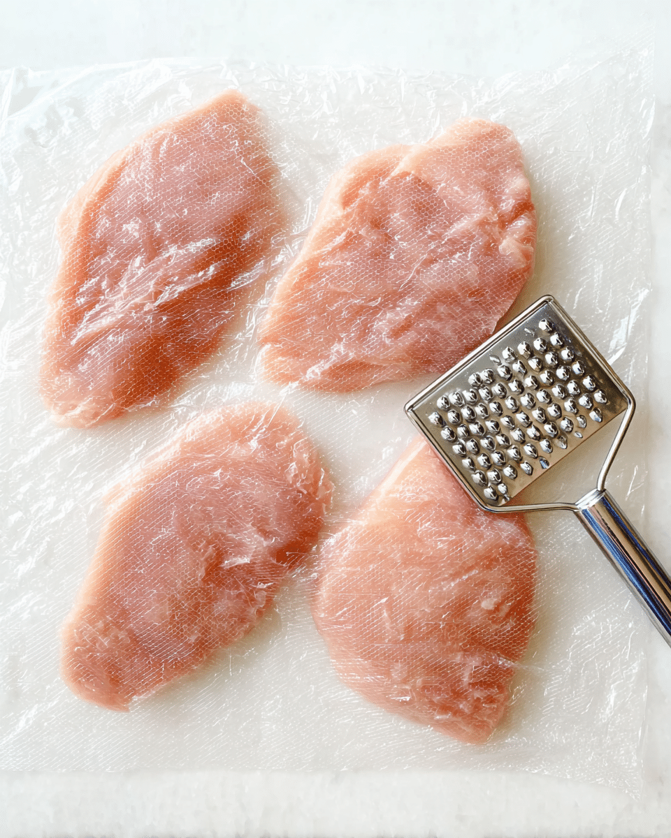 - I dredge each chicken breast in the flour first, then dip it in the egg, and finally coat it in the Parmesan-breadcrumb mixture, pressing lightly to help it stick.