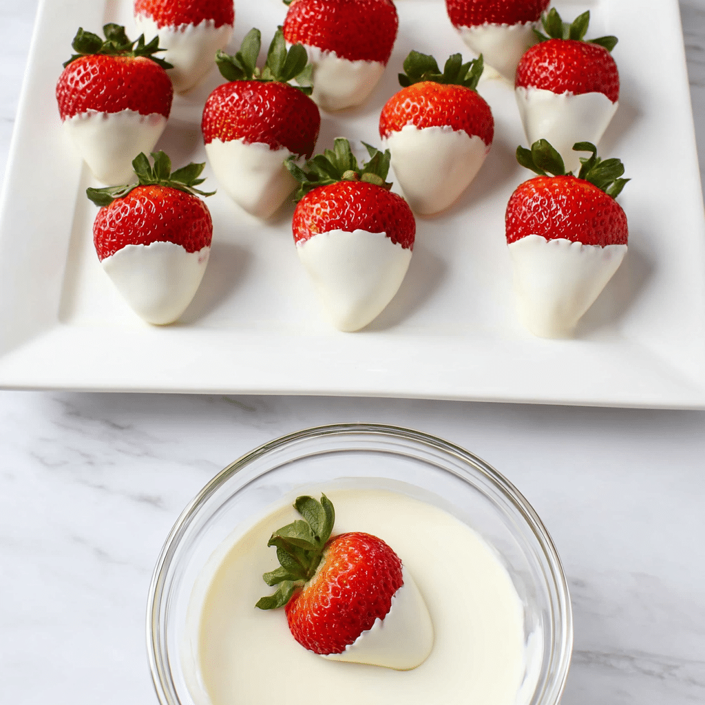 - Hold each strawberry by the stem (or you can use a toothpick if preferred) and dip it into the melted white chocolate, swirling gently to coat about two thirds of the berry.