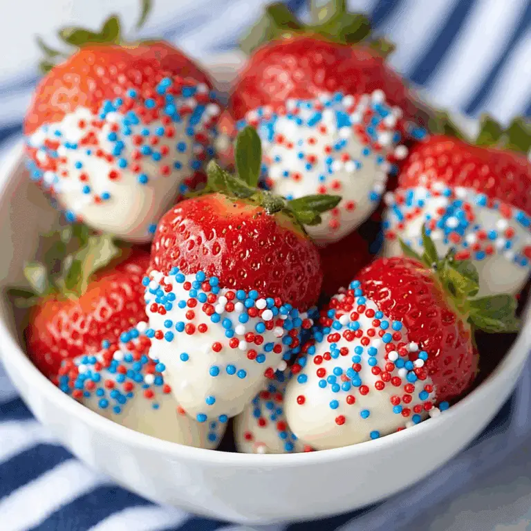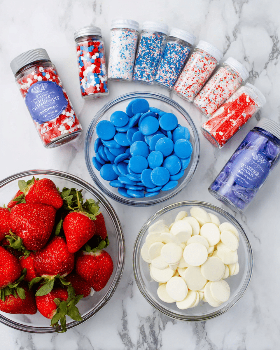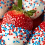 These patriotic chocolate-covered strawberries are a simple yet elegant treat made with juicy strawberries dipped in creamy white chocolate and finished with festive blue sugar crystals — perfect for holidays and celebrations.