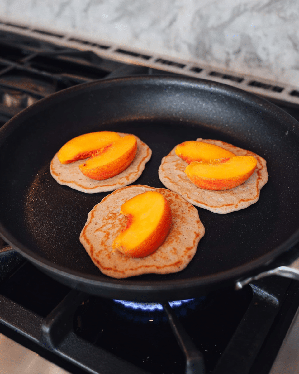 - Stack pancakes on a plate and spoon the warm peach topping over them.