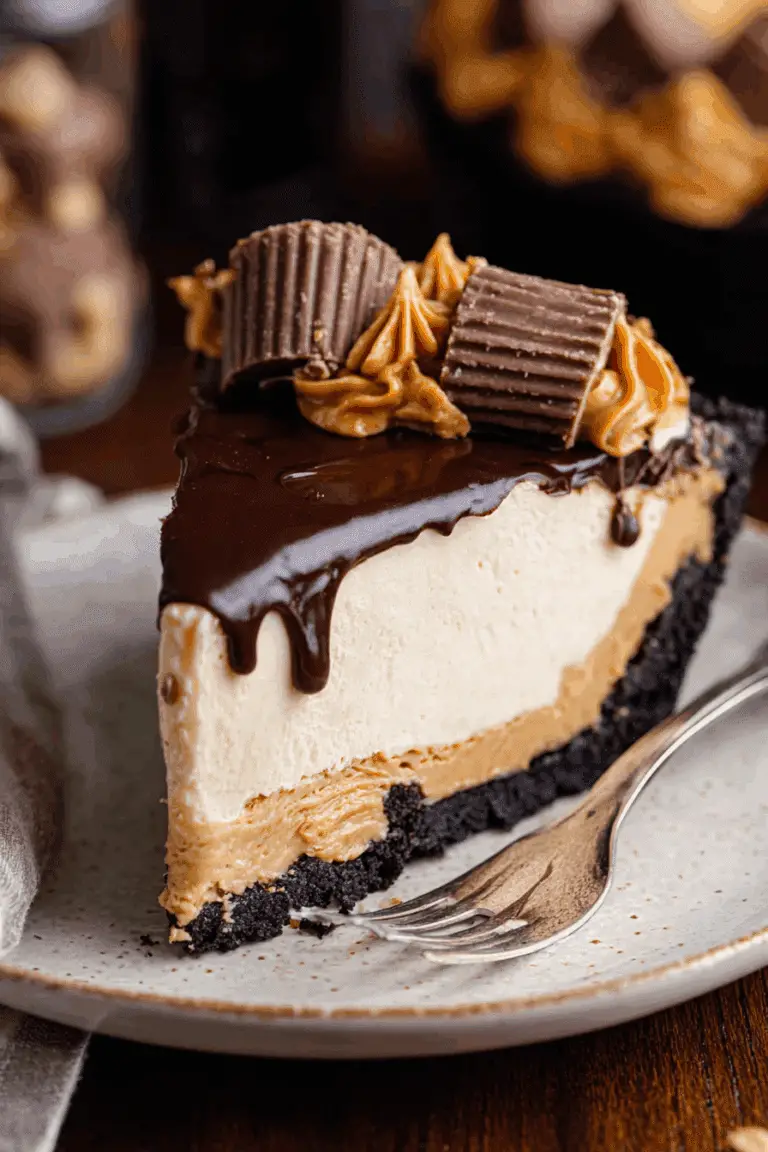 This peanut butter cheesecake is a rich, creamy, and decadent dessert that combines the nutty flavor of peanut butter with a smooth cream cheese base, layered on top of a chocolate Oreo crust. Topped with a luscious chocolate ganache and peanut butter whipped cream, it’s a show-stopping treat perfect for special occasions or whenever I want to indulge.