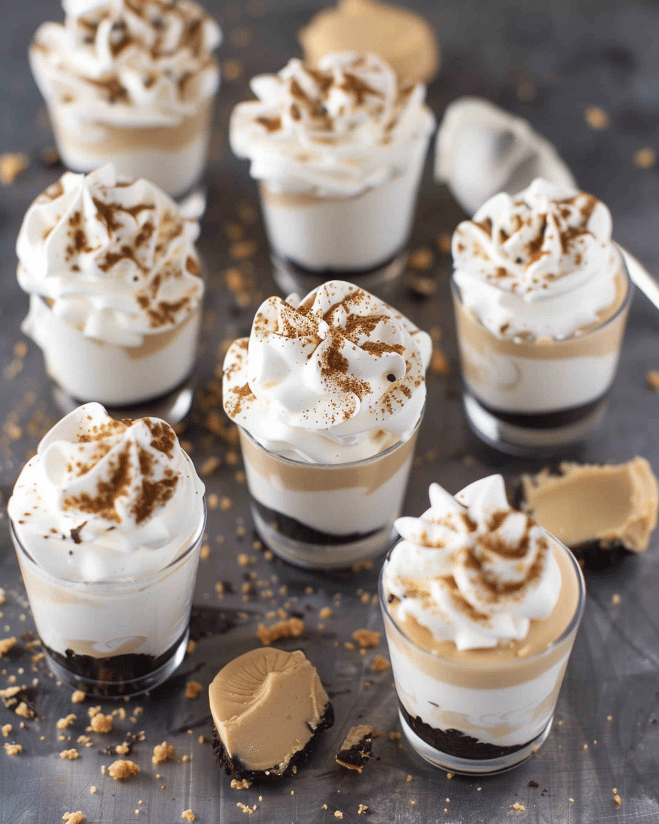- Top each shooter with extra Cool Whip and garnish with crushed Oreos, mini peanut butter cups, or chocolate drizzle if desired.