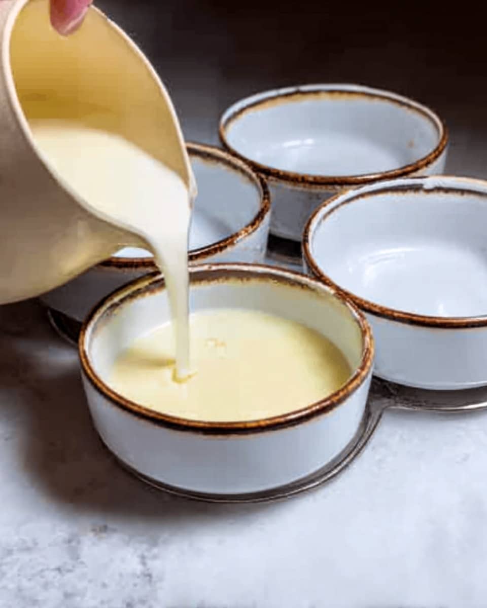 - I carefully pour the custard into the ramekins, filling each about three-quarters full.