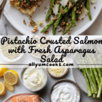 Pistachio Crusted Salmon with Shaved Asparagus Salad is a delicious and elegant dish featuring tender salmon filets topped with a creamy yogurt and mayonnaise mixture, coated in crunchy roasted pistachios, and oven-roasted to perfection. Served alongside a refreshing shaved asparagus salad tossed in a zesty lemon garlic dressing and topped with shaved Parmesan, this meal is a perfect balance of flavors and textures, ideal for a healthy and vibrant dinner.