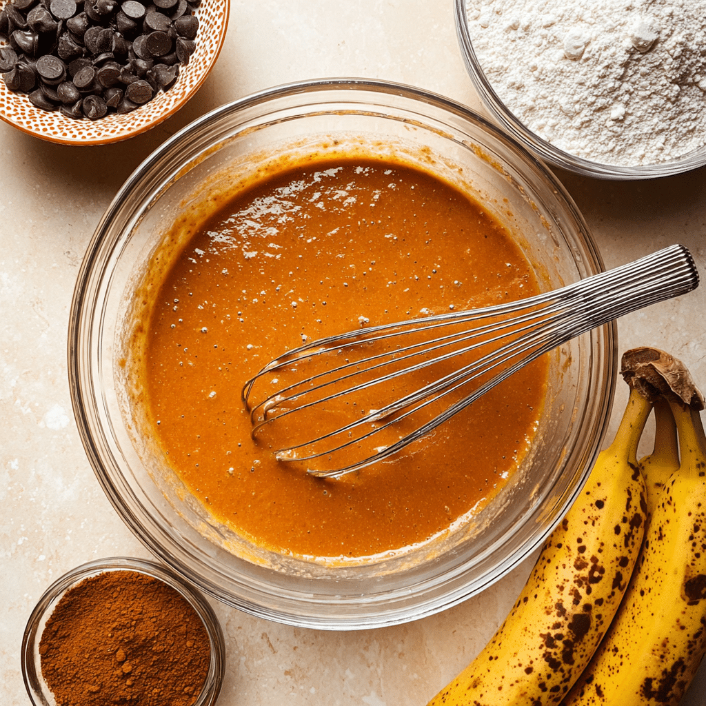 - In a separate large bowl, I mash the bananas until smooth, then stir in pumpkin puree, maple syrup, olive oil, almond milk, egg, and vanilla extract until well combined.