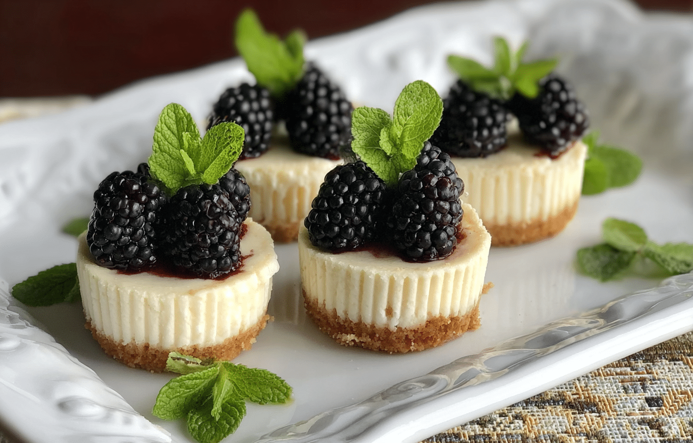- Just before serving, I top each mini cheesecake with fresh berries and garnish with mint sprigs.
