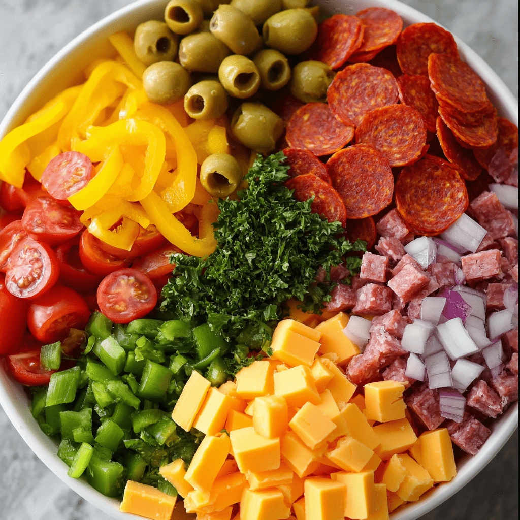 - In a large bowl, combine cooled pasta with chopped vegetables, meats, cheese, and olives.