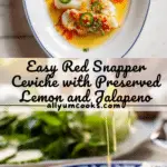 A refreshing and tangy Red Snapper Ceviche marinated in preserved lemon paste, olive oil, and seasonings. This no-cook dish is gently ‘cured’ by citrus flavors, with a vibrant topping of cilantro, jalapeño, and tomatoes, finished with fiery harissa and olive oil for an extra kick.