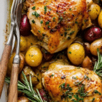 This Roast Split Chicken Breasts with Potatoes and Shallots recipe features bone-in, skin-on chicken breasts infused with a flavorful herb butter made from parsley, rosemary, thyme, garlic, and lemon. Served alongside roasted fingerling potatoes and sweet shallots, this one-pan dinner is perfectly seasoned, tender, and juicy, ideal for an elegant yet straightforward meal.
