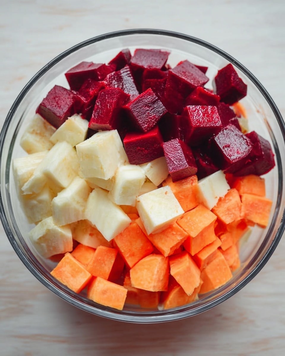 Cut beets and sweet potatoes into even cubes for consistent roasting.