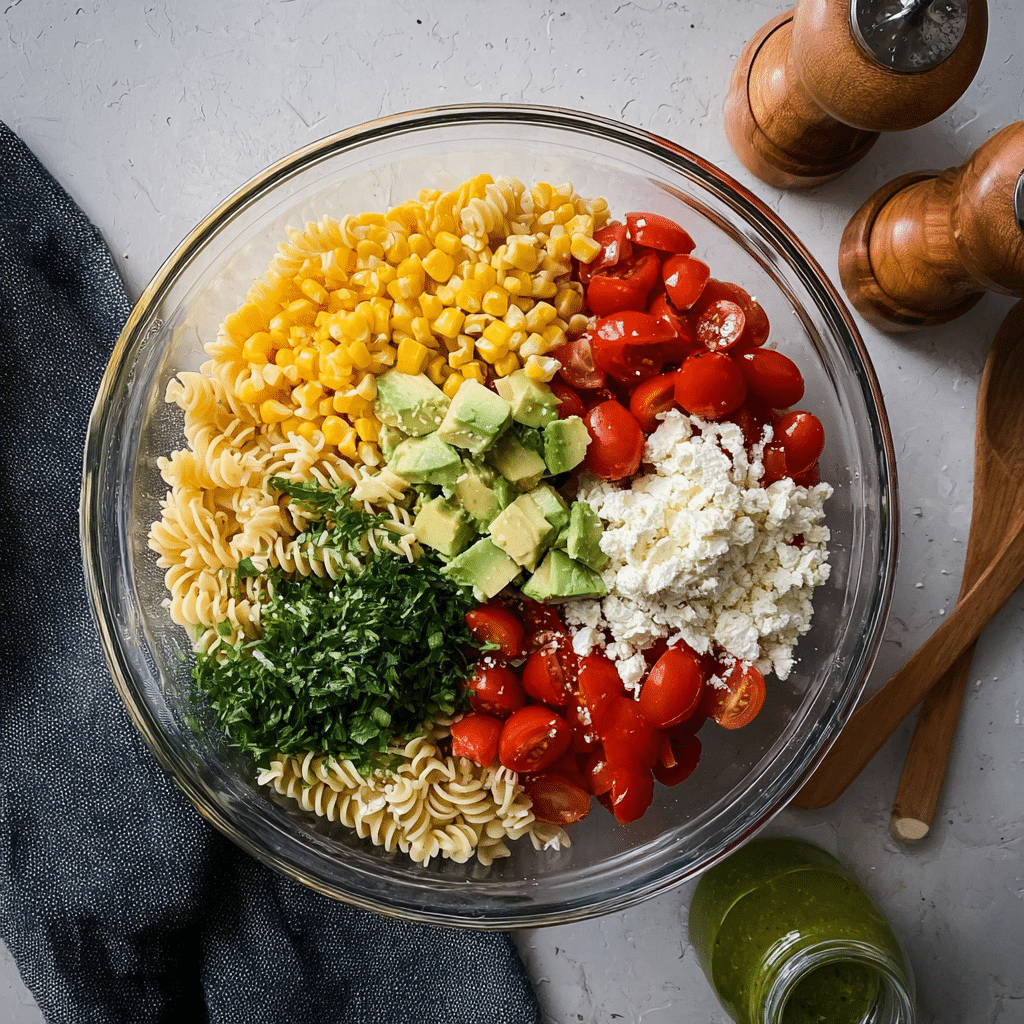 - In a large mixing bowl, I combine the cooked pasta, roasted corn, halved tomatoes, red onion, and chopped basil.