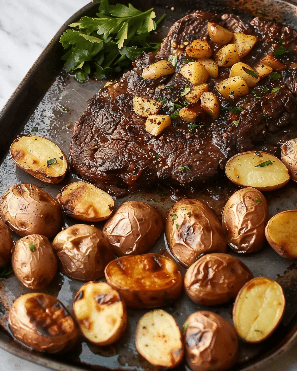 I store leftovers in an airtight container in the fridge for up to 3 days. To reheat steak, I prefer using a skillet over low heat so it doesn’t dry out. For the potatoes, I reheat them in the oven at 375°F until they crisp back up. Both the steak and potatoes can also be frozen separately for up to 2 months, though I find the potatoes are best fresh.