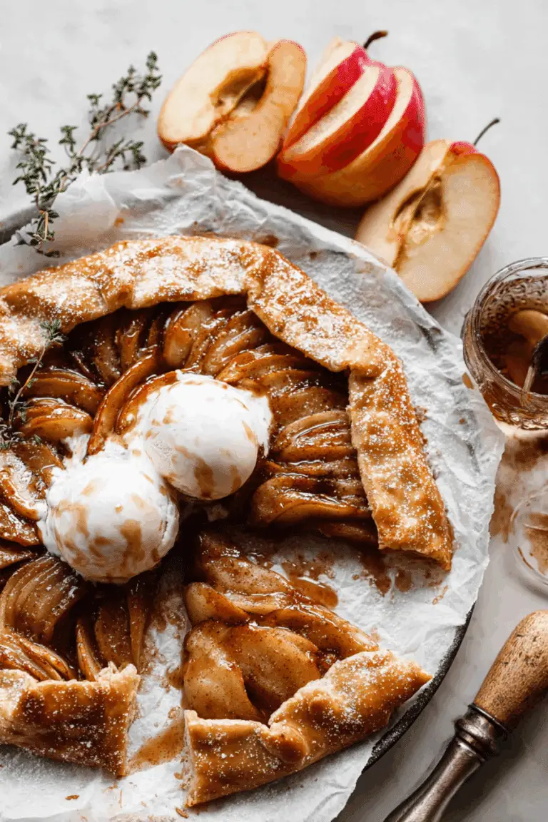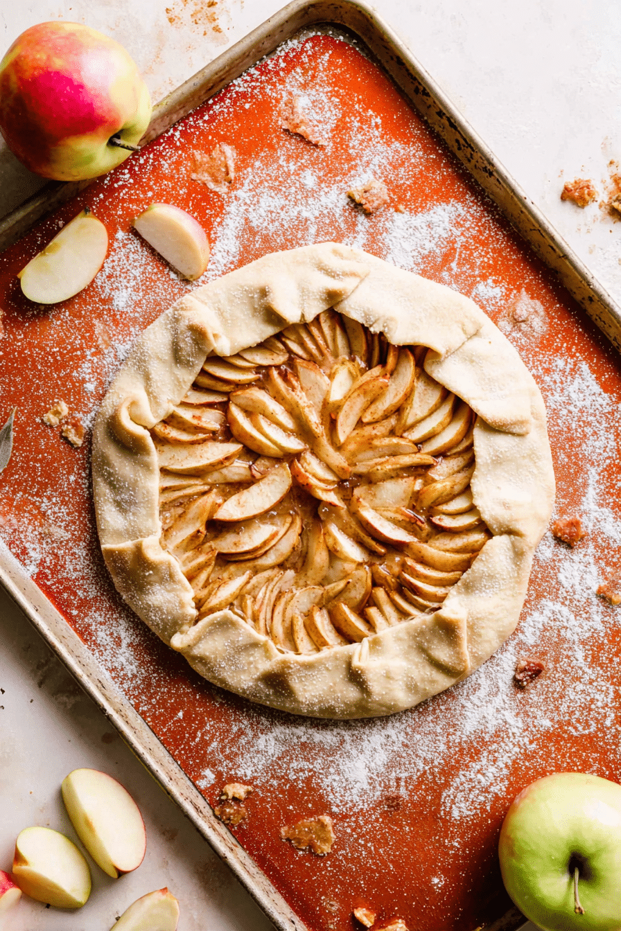 - Assemble: Roll chilled dough into a rough circle and place on a baking sheet. Arrange apples in the center, leaving a border. Fold edges over the filling.
