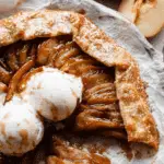 A rustic salted caramel apple galette with a flaky homemade crust, spiced apple filling, and a drizzle of salted caramel. Perfectly cozy and elegant, this dessert is easier than pie but just as delicious.