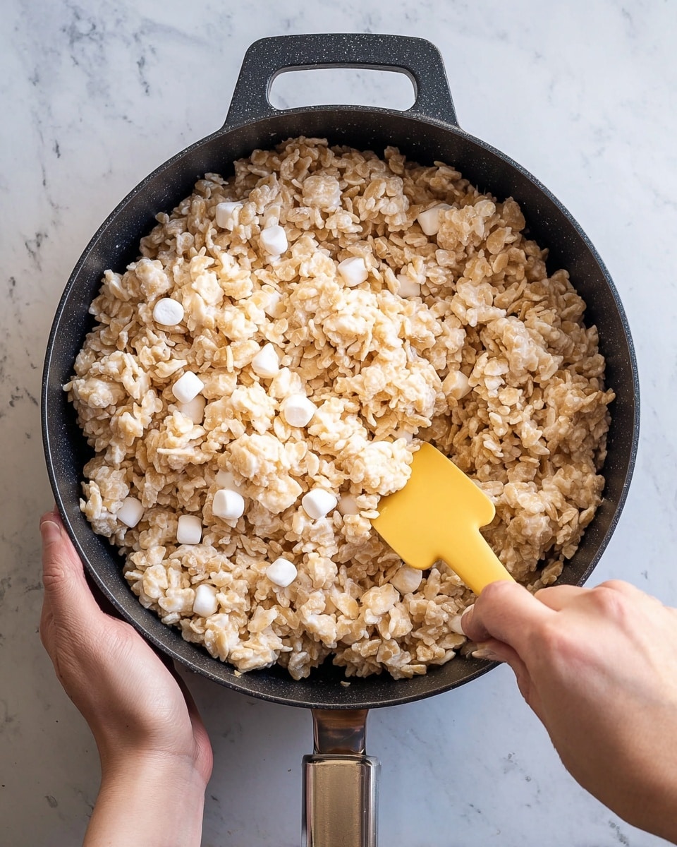 I avoid overpacking the mixture into the pan and don’t overcook the marshmallows—they should just melt smoothly.