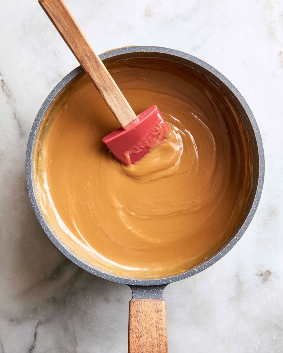 - Stir in 1/2 cup caramel sauce and kosher salt until smooth and combined.