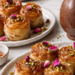 - Finish and Serve: Remove from the oven and allow to cool slightly. Drizzle honey over the warm rolls and sprinkle with chopped pistachios. Optionally, garnish with edible rose petals for an elegant touch. Serve warm or at room temperature.