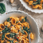 This recipe features homemade scissor cut noodles infused with pumpkin purée, combined with sautéed spinach and onions, and topped with vegan feta, fresh parsley, and chili flakes. It’s a comforting, colorful dish perfect for a quick and wholesome meal.