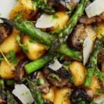 This Sheet Pan Asparagus Mushroom Gnocchi recipe offers a quick and flavorful weeknight meal featuring roasted gnocchi, tender asparagus, and earthy mushrooms, all tossed in a garlicky lemon dressing and topped with fresh parsley and shaved Parmesan.