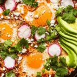 The finishing touches take this dish from tasty to unforgettable. Scatter slices of creamy avocado and crumbled cotija cheese over the eggs, then sprinkle fresh cilantro leaves and crunchy radish slices to add layers of texture and bright pops of color. Don’t forget to squeeze lime wedges over the top for a fresh citrus zing that brings everything alive.