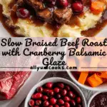 This slow-braised beef roast recipe features a tender beef cut, slowly cooked with aromatic herbs, garlic, and onion, then glazed with a tangy cranberry balsamic sauce. Perfect for a comforting dinner, the dish combines savory and sweet flavors with a rich gravy and vibrant vegetables.