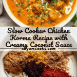 This Slow Cooker Chicken Korma is a rich and creamy Indian-inspired curry made with tender chicken thighs marinated in a fragrant blend of spices and yogurt, then slow-cooked with coconut milk and tomato paste to create a deeply flavorful and comforting dish. Perfect for busy days, it combines traditional korma spices like garam masala, turmeric, and cumin with a touch of chili for warmth, resulting in a mild yet aromatic curry that pairs beautifully with rice or naan.