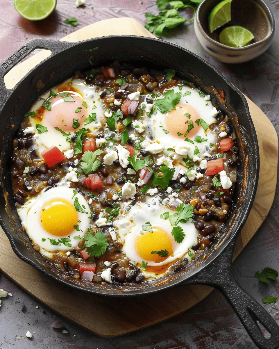Huevos enfrijolados are a Mexican-inspired dish of soft-cooked eggs nestled in a creamy, spiced black bean sauce, topped with fresh garnishes. It’s hearty, flavorful, and perfect for breakfast, brunch, or dinner.