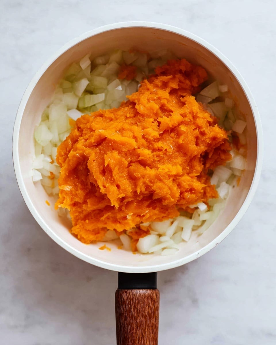- Add chopped onion and sauté for about 5 minutes until soft and translucent.
