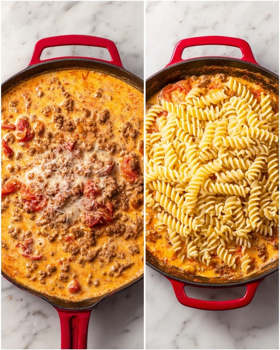 A rich and comforting one-pan creamy ground beef pasta made with tender pasta, juicy beef, and a velvety tomato-cream sauce. Perfect for busy weeknights, this hearty dish is full of flavor and ready in just 30 minutes.