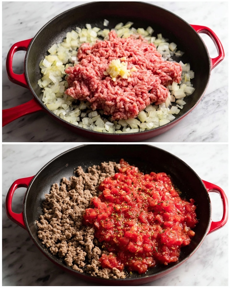 - Next, I add the ground beef and cook until browned, breaking it up with a spatula as it cooks. I season it lightly with salt and pepper at this stage.