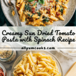 A creamy and flavorful sun dried tomato pasta made with penne, baby spinach, and a rich sauce of heavy cream, parmesan cheese, and sun dried tomatoes. This dish is easy to prepare and perfect for a comforting weeknight meal, combining the tangy taste of sun dried tomatoes with aromatic garlic and Italian herbs.