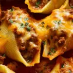This flavorful Taco Stuffed Shells recipe combines the comfort of Italian pasta with the bold spices of Mexican cuisine. Jumbo pasta shells are filled with a seasoned ground beef mixture, cream cheese, and enchilada sauce, then baked with salsa and cheese for a hearty, crowd-pleasing meal. Perfect for family dinners or entertaining, these stuffed shells offer a delicious twist on traditional taco ingredients in an easy-to-make baked pasta dish.