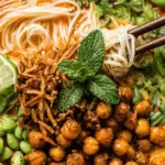 Divide the cooked noodles into serving bowls. Ladle the fragrant hot coconut curry broth with vegetables over the noodles, then generously top with your roasted chickpeas for that satisfying crunch. Finish with a sprinkle of fresh cilantro and any garnishes you love – a drizzle of chili oil, a squeeze of lime, crispy shallots, or toasted peanuts all make fantastic options. Serve immediately and enjoy every comforting spoonful.