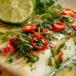 This Thai Lime-Garlic Steamed Fish with Coconut Lemongrass Sauce is a flavorful and aromatic dish featuring a whole steamed fish infused with zesty lime, garlic, and fragrant lemongrass in a creamy coconut sauce. Perfectly balanced with a touch of spice and sweetness, this light yet satisfying dish is great for a healthy dinner served alongside jasmine rice.